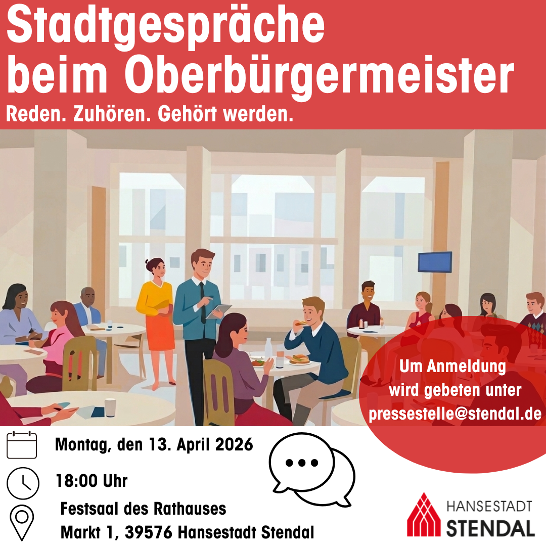 In einem neuen Konzept zur besseren Beteiligung der Stendaler Bürger*innen lädt Oberbürgermeister Bastian Sieler diese herzlich zu den Stadtgesprächen ein. Das offene Format beruht auf einem einfachen Prinzip: Hören und gehört werden. Los geht es am Montag, dem 13.04.2026, um 18:00 Uhr im Festsaal des Rathauses (Markt 1, 39576 Hansestadt Stendal).