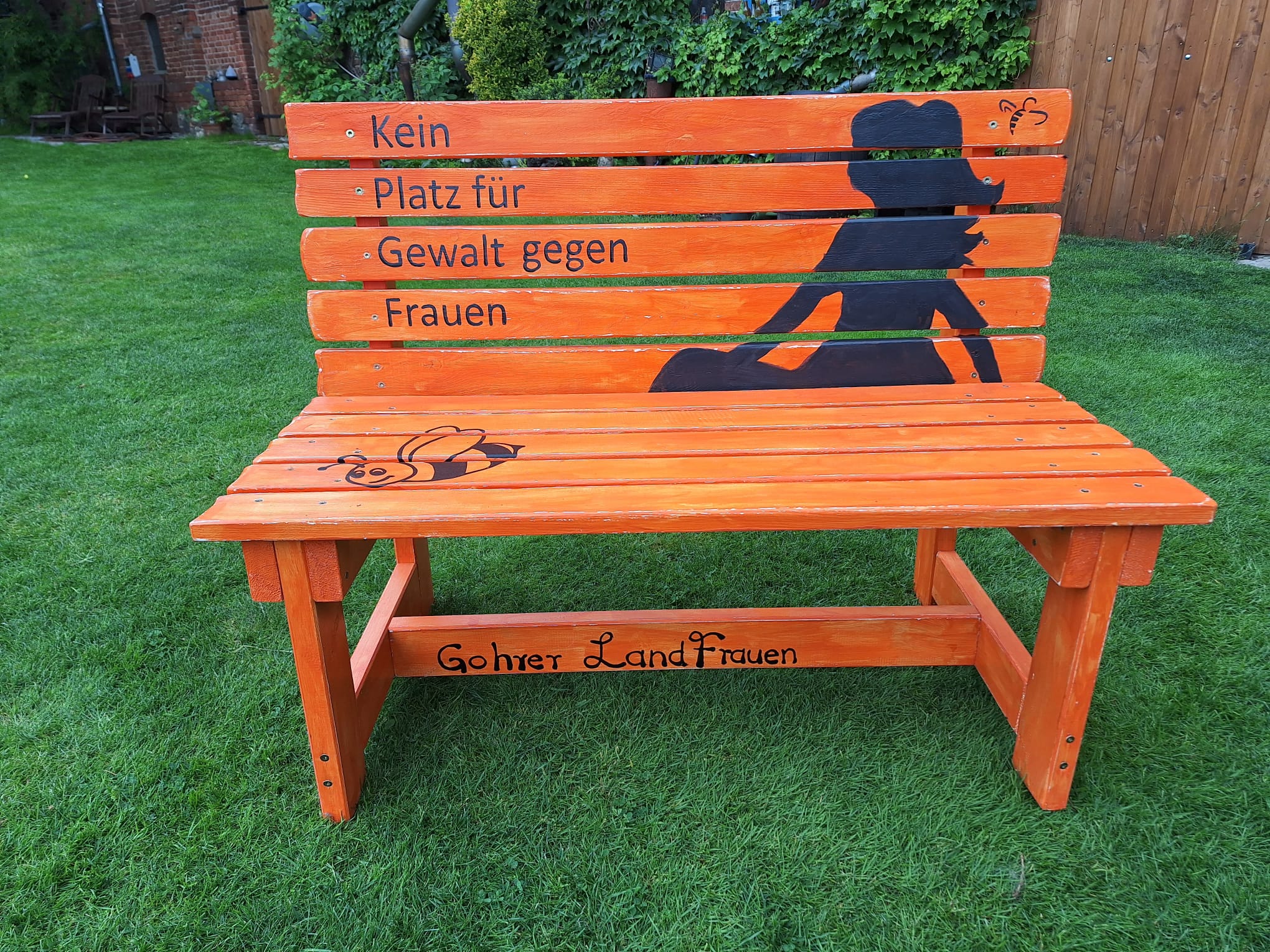 Die "Orange Bank" symbolisiert, dass bei uns kein Platz für Gewalt an Frauen ist und wandert ständig von Ort zu Ort. So war sie u.a. schon in Stendal und in Uchtspringe zu finden.