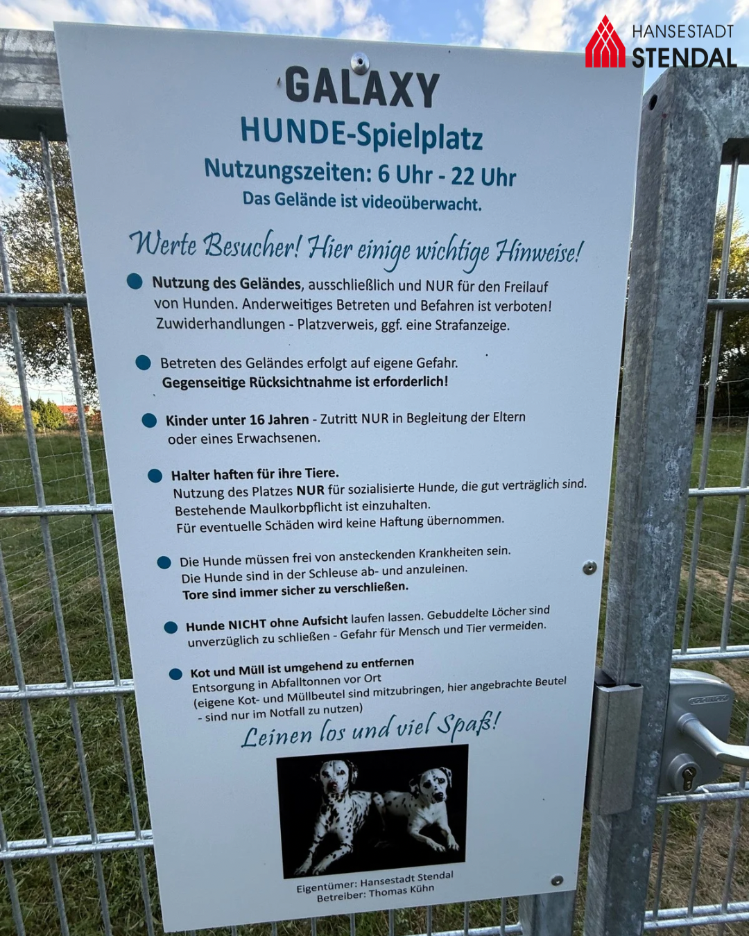 Am 1. Oktober wurde in Stendal der neue Hundespielplatz „GALAXY“ offiziell eröffnet. Das Gelände an der Osterburger Straße 40 (ehem. Otto-Krause-Bad, hinter dem Supermarkt) wird dem Betreiber Thomas Kühn von der Hansestadt Stendal zur Verfügung gestellt. Das circa 3200qm große Freigelände steht ab sofort allen Hundehalter*innen von 6:00 bis 22:00 Uhr zur Verfügung.