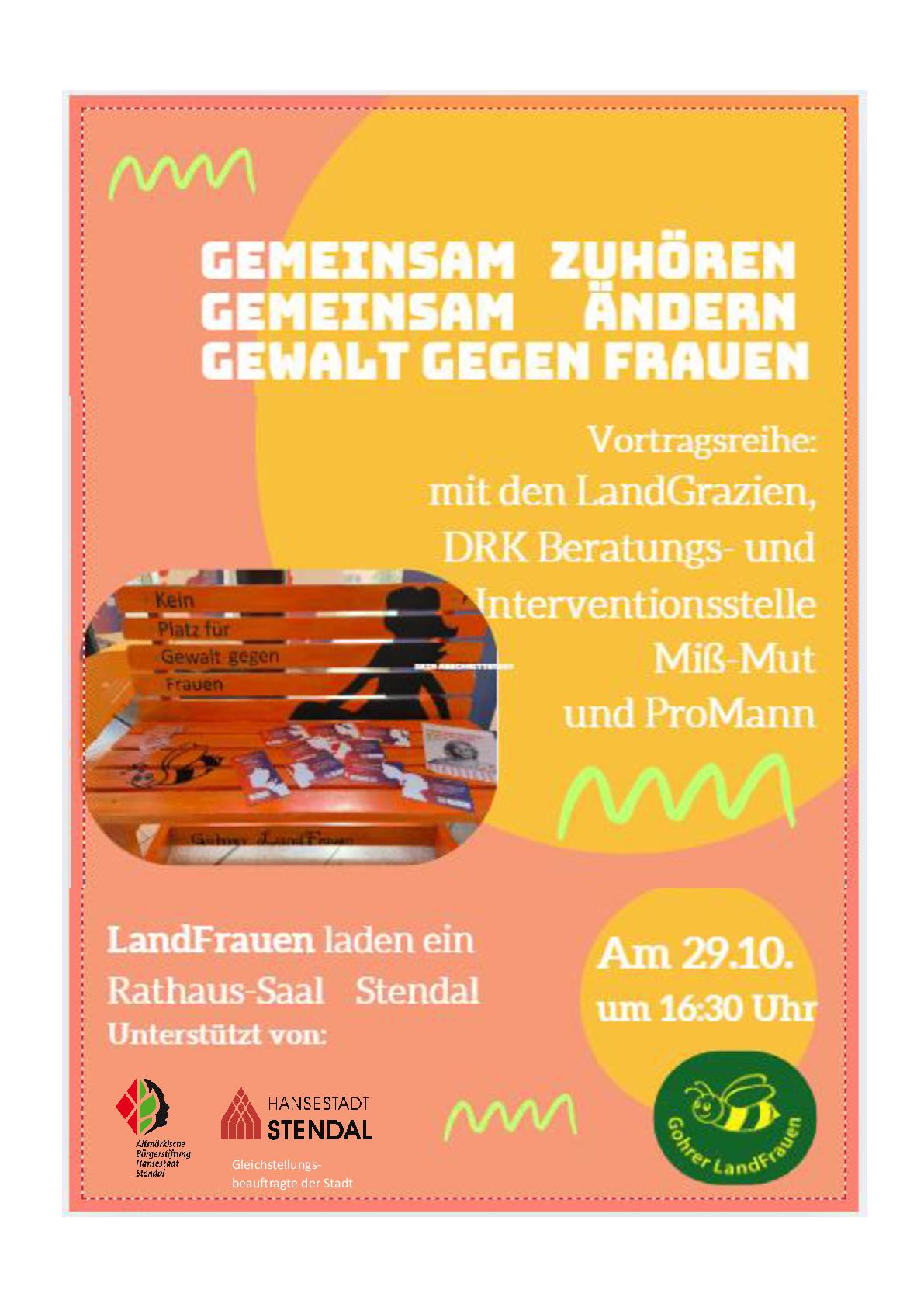 Am 29.10.2025 findet um 16:30 Uhr im Rathausfestsaal der Hansestadt Stendal eine Vortragsreihe zu dem Thema "Gewalt gegen Frauen" statt, zu welcher die LandFrauen einladen.