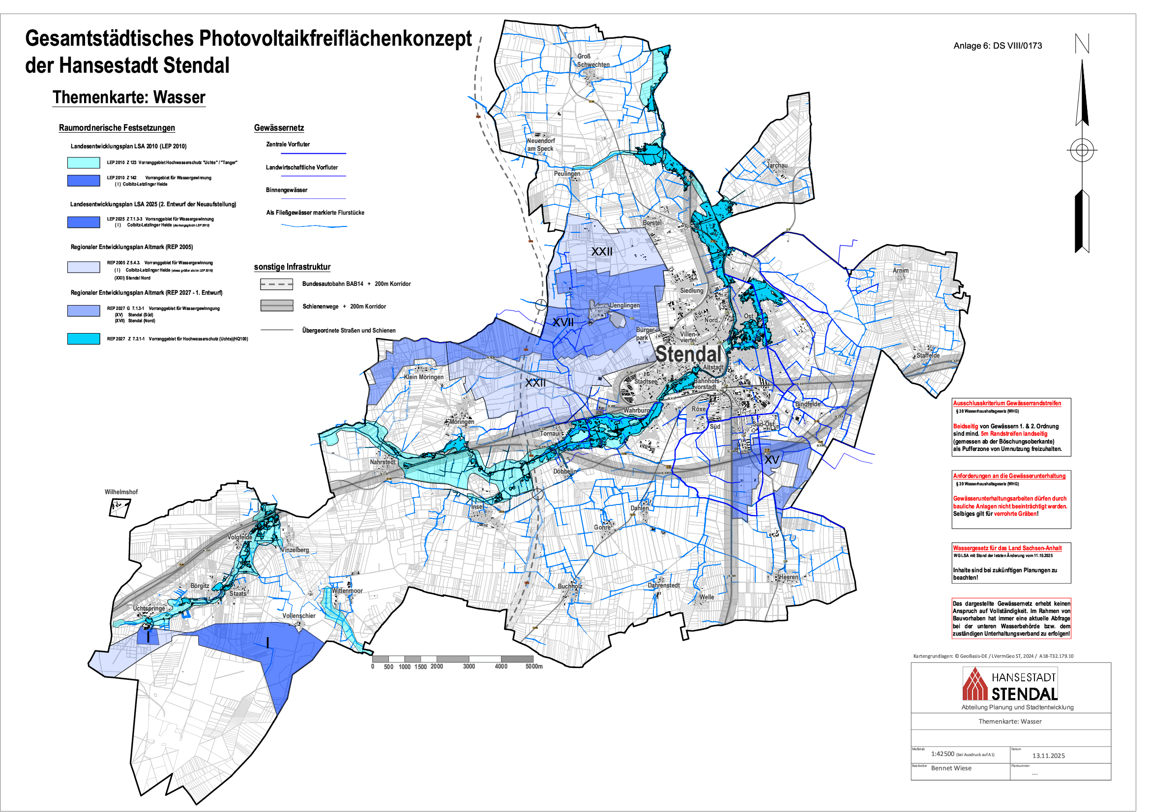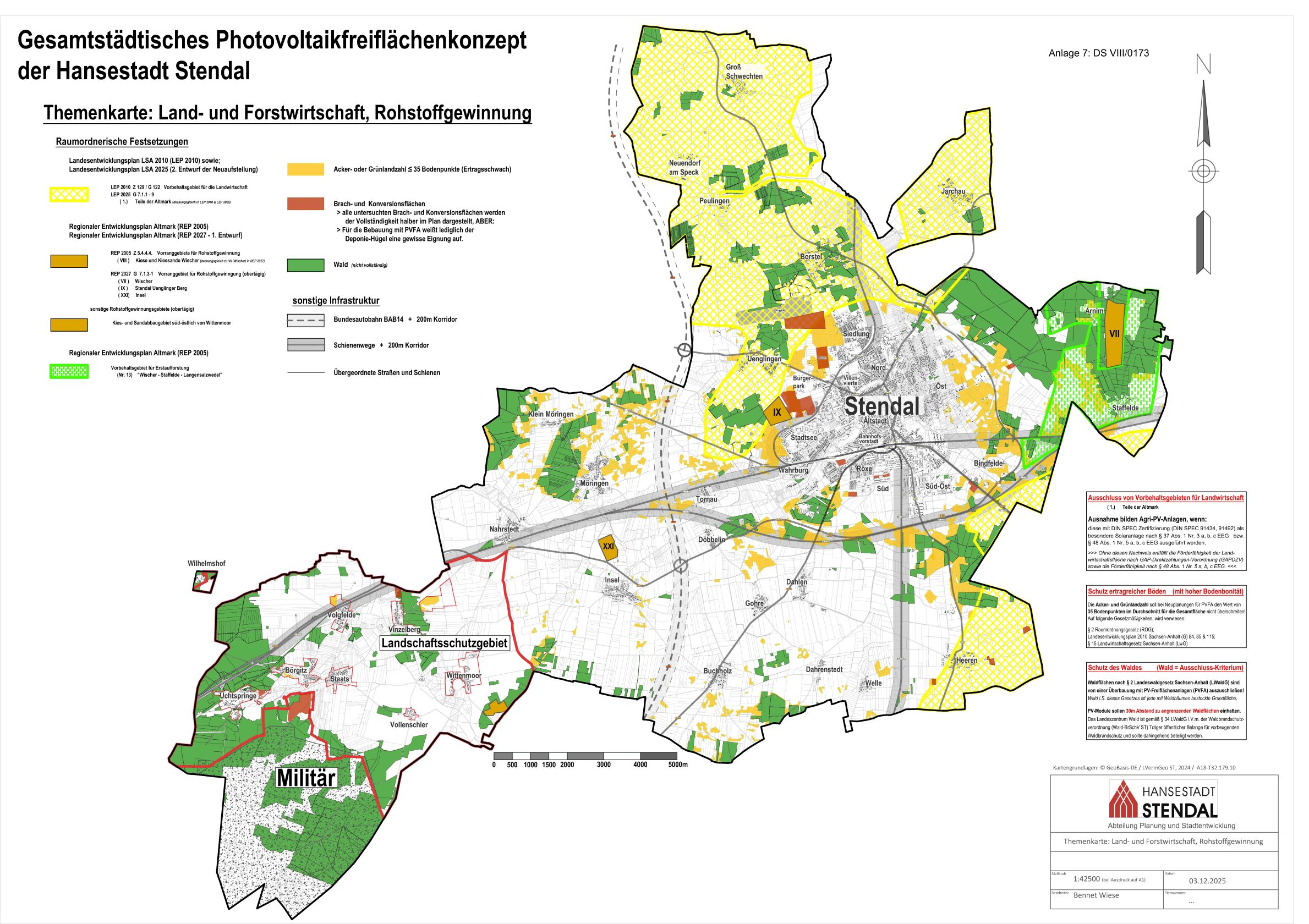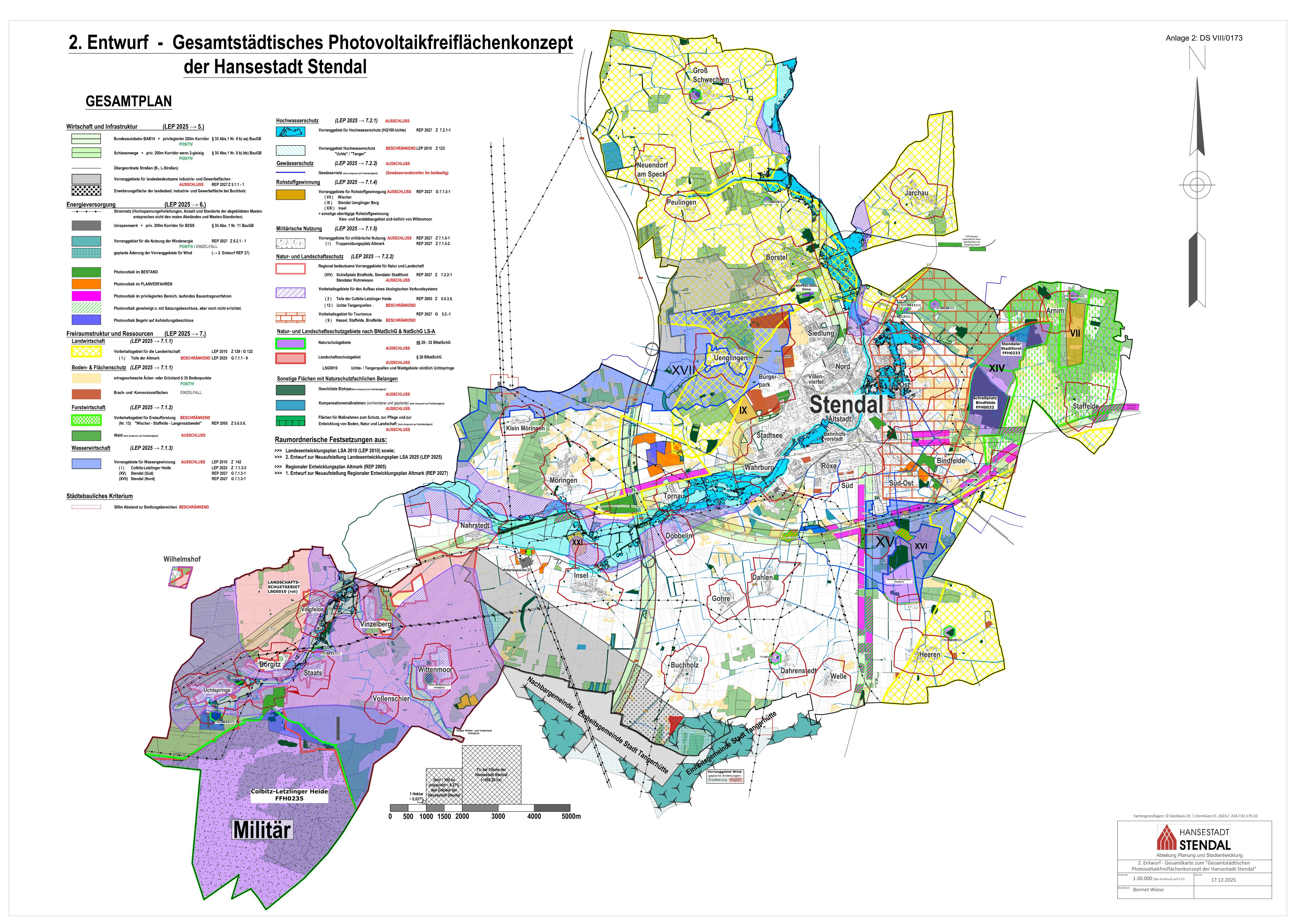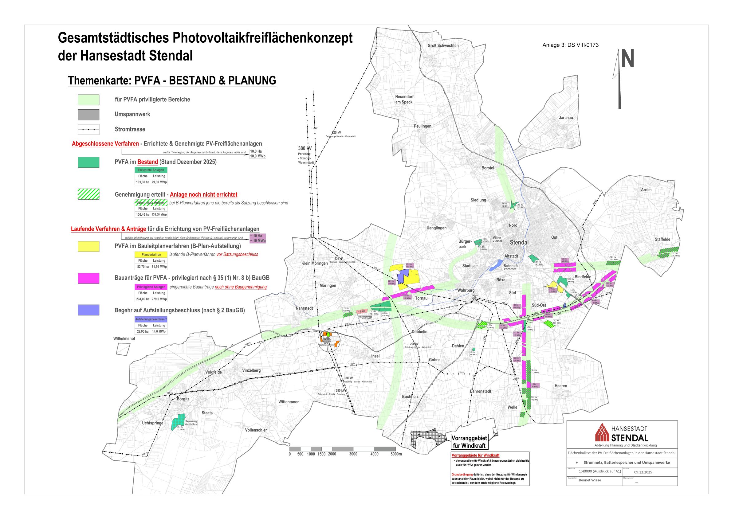 Das Photovoltaikfreiflächenkonzept zeigt: In Stendal gibt es aufgrund der besonderen geografischen Lage – etwa durch die Autobahn A14 und die Schieneninfrastruktur – ausreichend Flächen, die für Photovoltaikanlagen genutzt werden können. Viele dieser Flächen sind sogar „privilegierte Bereiche“, für die die Stadt keine direkte Steuerungsmöglichkeit hat. Der Stadtrat der Hansestadt Stendal hat daher in seiner Sitzung am 09.02.2026 beschlossen: Es besteht aktuell kein Bedarf, weitere Bauleitplanungen oder Sondergebiete speziell für Photovoltaikfreiflächenanlagen (PVFA) auszuweisen. Die Stadt wird keine zusätzlichen Planungen vornehmen, um neue Flächen für PVFA zu erschließen.