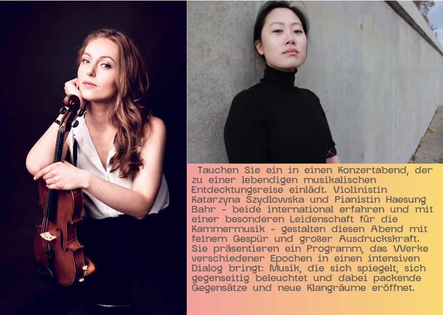 Tauchen Sie ein in einen Konzertabend, der unter dem Motto »Echo und Kontraste« zu einer lebendigen musikalischen Entdeckungsreise einlädt. Die Violinistin Katarzyna Szydlowska und die Pianistin Haesung Bahr – beide international erfahren und mit einer besonderen Leidenschaft für die Kammermusik – gestalten diesen Abend mit feinem Gespür und großer Ausdruckskraft. Sie präsentieren ein Programm, das Werke verschiedener Epochen in einen intensiven Dialog bringt: Musik, die sich spiegelt, sich gegenseitig beleuchtet und dabei packende Gegensätze und neue Klangräume eröffnet.
