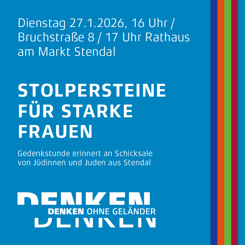 Am Tag des Gedenkens an die Opfer des Nationalsozialismus werden in Stendal um 16 Uhr Stolpersteine für drei starke Frauen verlegt. Vor dem Haus Bruchstraße 8 erinnern sie künftig an Esther Streifler, geb. Grünberg, und ihre Töchter Marie Streifler und Frieda Kaufmann, geb. Streifler. Um 17 Uhr lädt die Geschichtswerkstatt Stendal e.V. zu einer Gedenkstunde in den Festsaal des Rathauses ein. In diesem Rahmen werden die Rechercheergebnisse zu den Biografien von Esther Streifler und ihren Töchtern präsentiert. Weitere Beiträge berichten u.a. über das Schicksal der Familie Wolfowitz. Im Mittelpunkt der Gedenkstunde steht, wie Menschen sich unter extrem schwierigen Umständen mutig behauptet haben.