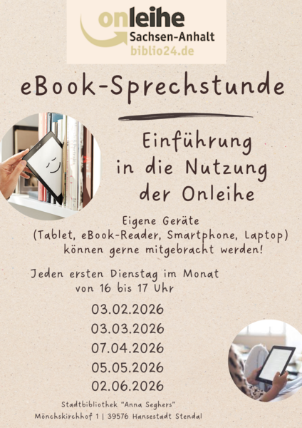 Jeden ersten Dienstag im Monat findet in der Stendaler Stadtbibliothek "Anna Seghers" um 16 Uhr die eBook Sprechstunde statt.