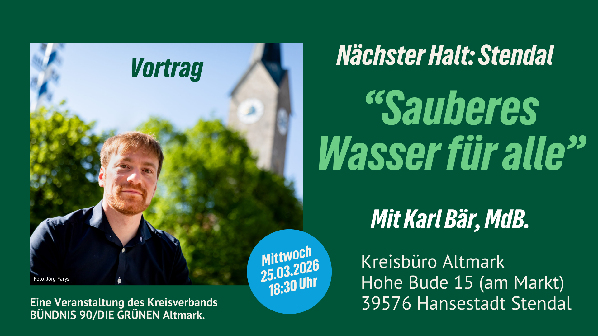 In unserer Reihe „Nächster Halt: Stendal“ begrüßen wir Altmarkgrüne diesmal Karl Bär, Bundestagsabgeordneter von BÜNDNIS 90/DIE GRÜNEN und stellvertretender Vorsitzender des Ausschusses für Landwirtschaft, Ernährung und Heimat des Deutschen Bundestages. Mit ihm möchten wir über die Wasserpolitik der Zukunft ins Gespräch kommen – konkret, lösungsorientiert und mit Blick auf die besonderen Herausforderungen unserer Region.