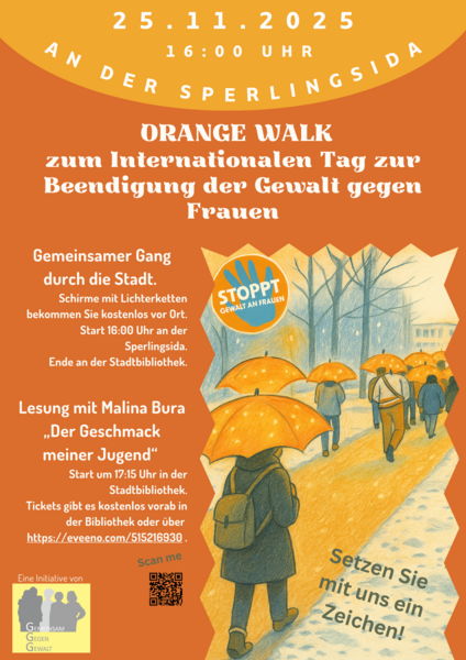 Vor Beginn der Lesung organisiert die DRK Beratungsstelle Miß-Mut einen „Orange Walk“ – einen gemeinsamen Gang durch die Stadt, der ein sichtbares Zeichen gegen Gewalt an Frauen setzt und zur Reflexion und Solidarität aufruft.