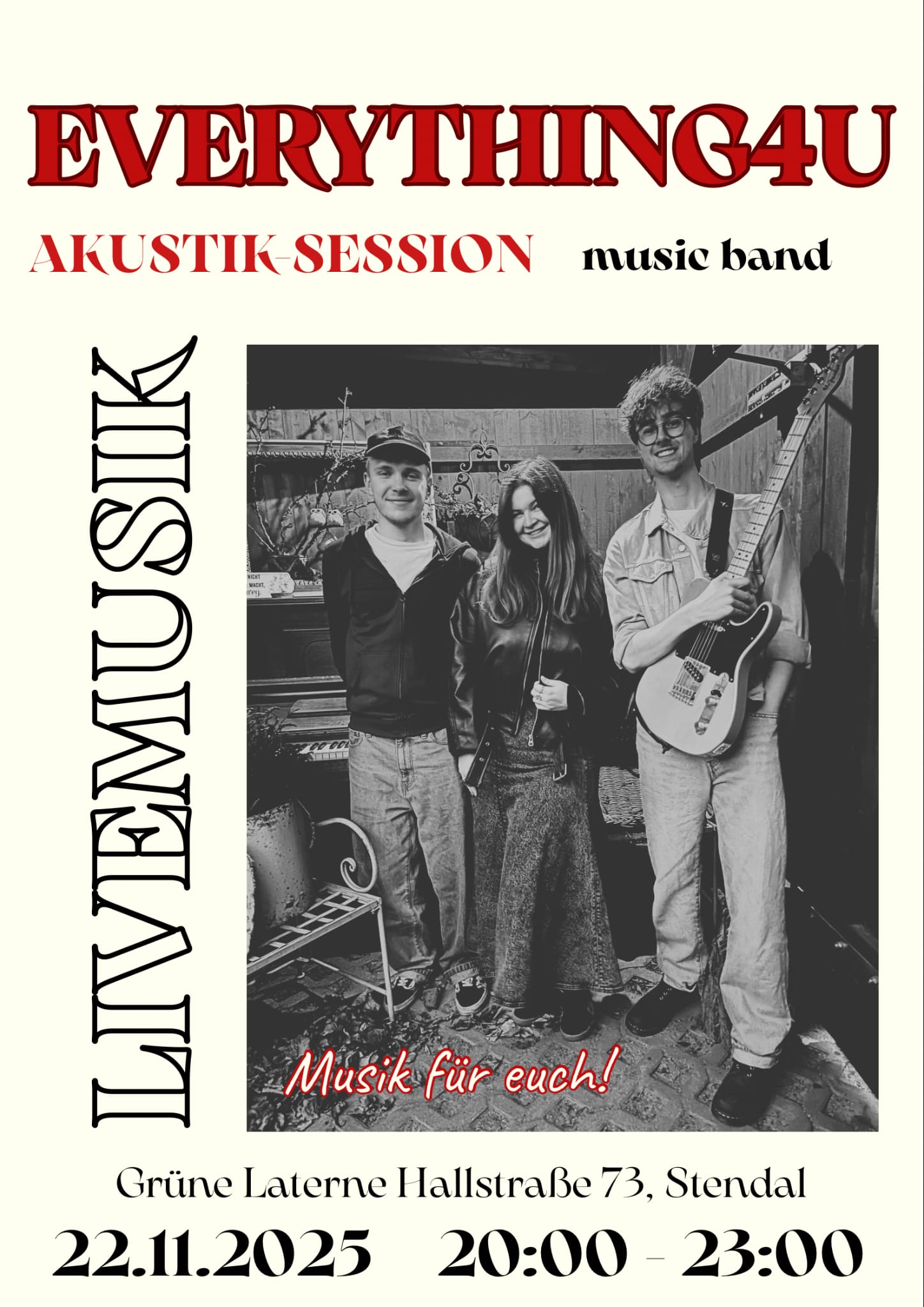 Mit einer Akustik-Session präsentiert sich die Nachwuchs-Band „Everything4U“ am Sonnabend, 22. November, von 20 bis 23 Uhr im Stendaler Traditions-Gasthaus „Zur Grünen Laterne“ (Hallstraße 73). Das Trio besteht aus Aleksandryna (Gesang), Edgar (Gitarre) sowie Ole (Piano) und steht für handgemachte Musik mit Herz. Nach ihrem Auftritt beim Burgfest in Tangermünde sind sie in der Adventszeit auch auf mehreren Weihnachtsmärkten der Region zu erleben. Wer Lust auf ehrliche Livemusik in gemütlicher Atmosphäre hat, sollte sich den Abend in der „Grünen Laterne“ nicht entgehen lassen; ganz nach dem Band-Motto Everything4U – Musik für euch. Der Eintritt ist frei.