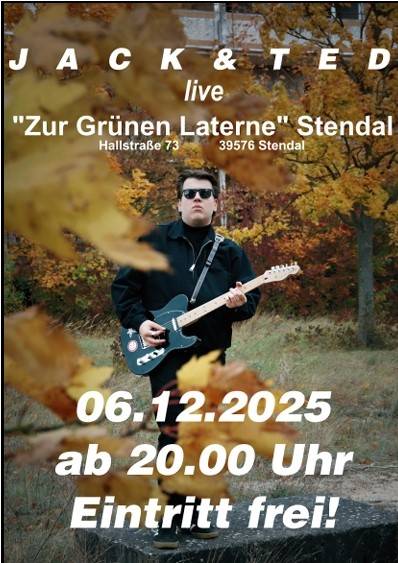 „Musik pur“ heißt es am Sonnabend, 6. Dezember, ab 20 Uhr im Stendaler Traditions-Gasthaus „Zur Grünen Laterne“ (Hallstraße 73). Hier sorgen Jack & Ted für beste Stimmung mit handgemachter Musik, gefühlvollen Melodien und mitreißenden Rhythmen. Die Musik von Jack & Ted verbindet Gitarrenmelancholie mit Folkelementen und feinfühligem Songwriting. Auf dem Programm stehen Songs der im Oktober 2025 erschienenen EP „From Exile“, unveröffentlichte Stücke sowie Coverversionen. Das Konzert verspricht einen Abend zwischen Rock, Pop, Folk und Indie.